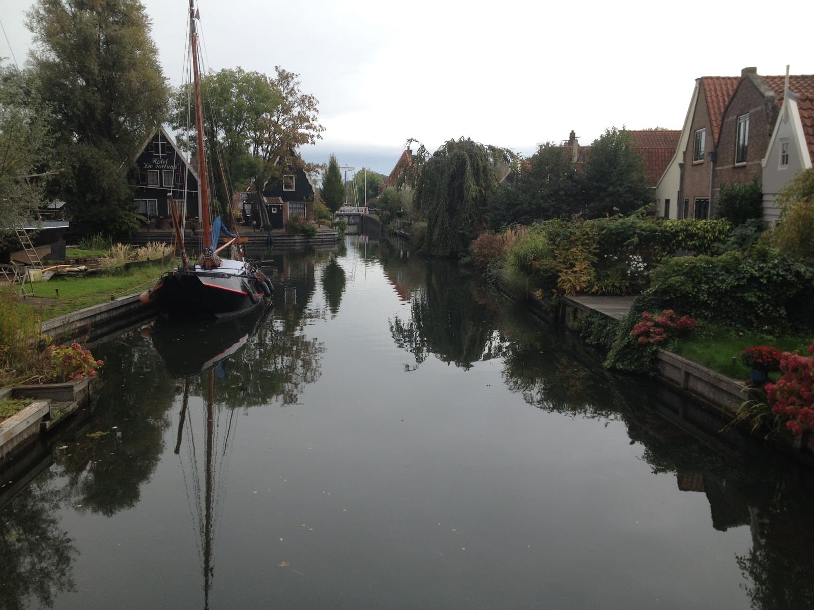 edam kanalAlabildiğince yeşil geniş düzlüklerden geçerken gerçekten de haritada görüldüğü gibi uçsuz bucaksız hayvan çiftlikleri var. Hayatımda hiç bu kadar fazla ineği birden gördüğümü hatırlamıyorum. Hayvancılık bu kadar gelişmişken hem et ucuz oluyor hem de birçok çeşit peynir üretiliyor. İşte, Hollanda’nın Ezine’si diyebileceğimiz Edam, Amsterdam’a 20 km mesafede ve kardeş köyü Volendam ile arasında 3 km var. Yazın güzel bir havada rahatlıkla yürünebilir ancak Kasım bunun için çok da elverişli değil. Esasında iki köy tarihsel olarak da birbirlerine bağlı olmasının yanı sıra yapısal olarak da iç içe geçmiş ve bugün tek bir belediye olarak yönetiliyor.  Her ne kadar bugün deniz kenarındaki Volendam’ın nüfusu Edam’ın üç katı büyüklüğünde  olsa da 1230 yılında kurulan Edam, orta çağ döneminde daha güçlü bir konuma sahipmiş.