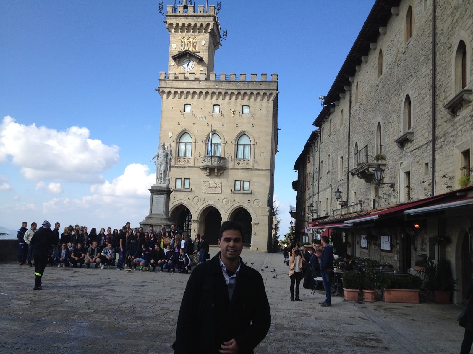 san marino meydanEfsane odur ki 257 yılında Riminili duvar ustası Marinus (hımm, duvar ustası, ilginç) Hıristiyanları idam eden Romalıların elinden kaçmak için Titius dağına tırmanır ve burada bir manastır topluluğu kurar. Aziz olan Marinus’un adıyla 301 yılında bu dağın tepesinde ülke kurulur. Esasında ülke Monaco’dan 20 kat daha büyük ama dağın tepesindeki eski şehir dışında her yer sanayi tesisleri olduğu için görülecek tek yer dağın tepesi. Uzaktan dimdik dağ büyüyor da büyüyor. Otobüs bile zorla tırmanırken,  dünyanın en eski Cumhuriyeti olan bu küçücük ülkenin 17 yüzyıldır nasıl hiç istila edilmediğini anlamak pek de zor değil. Zira ben de asker olsam etrafı üç kuleyle çevrilmiş bu kale şehre tırmanmaya üşenirim.  Zaten otobüs bile belli bir yere kadar geliyor sonra duvarların içine girmek için biraz merdiven tırmanmak gerekiyor.
