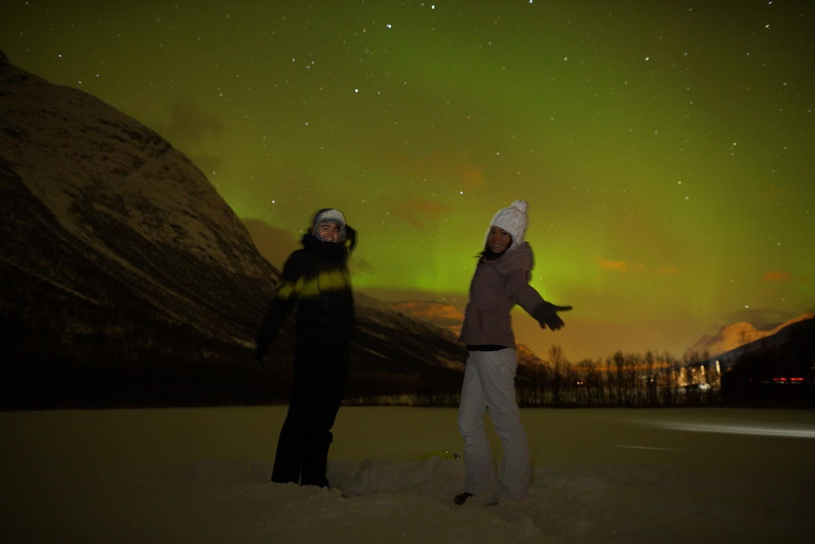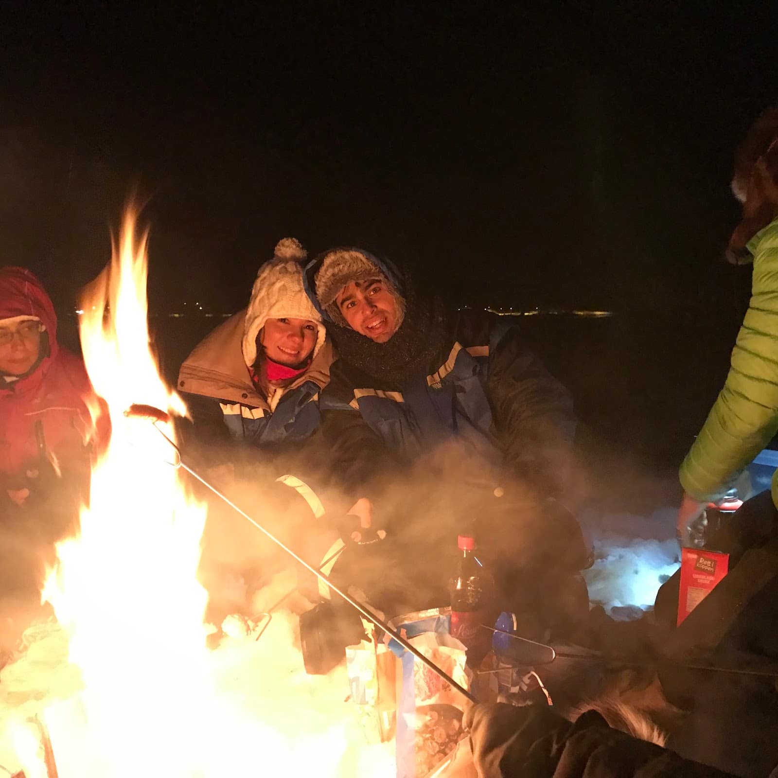 Bir süre daha arabayla gittikten sonra bir gölün kıyısında iki dağın arasında ışıklar bizi tekrar karşılıyor. Bu defa çok daha panoromik, çok daha göz kamaştırıcı. Ekip olarak büyülenmiş gözlerle ışıklara bakıyoruz. İspanyol kızlar birbirlerine sarılıp sevinçten zıplıyorlar. Roy herkes memnunsa burada kamp kuruyoruz diyor. Çok değil, sadece 10 dakika içersinde -15 derecede ayaklarımızı hissetmeyecek konuma gelince Roy’dan ekstra kıyafet ve bot kiralamaya karar veriyoruz. 2 saat boyunca kamp yaptığımızı düşününce o kıyafetler olmasa asla dışarıda duramazdık. Işıklar oradan oraya dans ederken Roy kamp ateşini yakıp elimize şişleri tutuşturuyor ve dondurulmuş köfte ve balık eşliğinde akşam yemeğimizi Kuzey Işıkları eşliğinde ediyoruz. Gece 2’de otelimize vardığımızda adeta bir görevi tamamlamanın mutluluğunu yaşıyorduk.